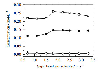 图 2 表观气体流速对产物浓度的影响 Fig.2 Effects of superficial gas velocity on product concentration ‒□‒ cyclohexanol ‒●‒ cyclohexanone ‒▲‒ CHHP ‒◇‒ adipic acid |