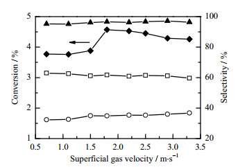 图 3 表观气体流速对转化率和选择性的影响 Fig.3 Effects of superficial gas velocity on conversion and selectivity ‒▲‒ cyclohexanol + cyclohexanone + CHHP ‒◆‒ cyclohexane ‒□‒ cyclohexanol ‒○‒ cyclohexanone |