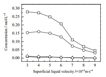 图 4 表观液体流速对产物浓度的影响 Fig.4 Effects of superficial liquid velocity on product concentration ‒□‒ cyclohexanol ‒○‒ cyclohexanone ‒△‒ CHHP ‒◇‒ adipic acid |