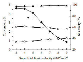 图 5 表观液体流速对转化率和选择性的影响 Fig.5 Effects of superficial liquid velocity on conversion and selectivity ‒▲‒ cyclohexanol + cyclohexanone + CHHP ‒◆‒ cyclohexane ‒□‒ cyclohexanol ‒○‒ cyclohexanone |