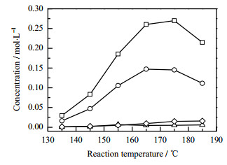 图 6 反应温度对产物浓度的影响 Fig.6 Effects of reaction temperature on product concentration ‒□‒ cyclohexanol ‒○‒ cyclohexanone ‒△‒ CHHP ‒◇‒ adipic acid |