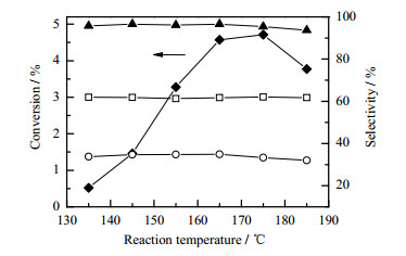 3.3 反应温度的影响环己烷氧化反应是个平行-串联的复合反应体系[2],反应温度对不同反应呈现不同的影响,最终决定氧化反应产物的选择性。实验中固定反应压力为1.4 MPa,液体表观速度为0.004 m·s-1,气体表观速度为1.80 m·s-1,催化剂浓度10 ppm,引发剂浓度0.2 %(wt),考察了反应温度(135 ~ 185℃)对环己烷氧化反应的影响,结果见图 6和图 7。从图中可以看出,在温度较低时,环己烷转化率和各产物浓度都较低。随着反应温度的升高,环己烷氧化反应速度加快,除CHHP外其他产物浓度明显增大,其中环己酮和环己醇分别在170 ~ 175℃达到浓度最高值后逐渐下降,而己二酸浓度却缓慢单调上升。这是因为环己烷氧化为自由基链式反应,反应温度升高加快了自由基引发速率和氧化反应速速率,但反应温度继续升高(大于170℃),则有利于环己烷氧化产物环己醇和环己酮发生深度氧化、生成酸类化合物,因此环己烷氧化与环己醇、环己酮氧化为竞争反应过程,更多的溶解氧被环己醇和环己酮氧化反应所消耗,从而导致环己烷氧化反应速率下降,即环己烷转化率下降,综合结果造成环己醇和环己酮浓度也随之下降。同时,温度升高后期也可能导致沸点相对较低的环己烷气化加剧,从而降低转化率。