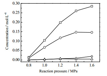 图 8 压力对产物浓度的影响 Fig.8 Effects of reaction pressure on product concentration ‒□‒ cyclohexanol ‒○‒ cyclohexanone ‒△‒ CHHP ‒◇‒ adipic acid |
