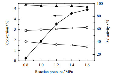 图 9 压力对转化率和选择性的影响 Fig.9 Effects of reaction pressure on conversion and selectivity ‒▲‒ cyclohexanol + cyclohexanone + CHHP ‒◆‒ cyclohexane ‒□‒ cyclohexanol ‒○‒ cyclohexanone |