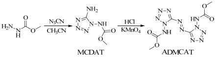 (1) 以甲氧基甲酰肼为原料,经加成、环化和偶氮化等反应合成了ADMCAT,该合成方法具有较强的普适性和推广性。
