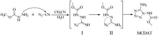 图 2 1-甲氧基甲酰基-1, 5-二氨基四唑(MCDAT)的合成机理 Fig.2 Synthetic route of 1-methoxy methylamide-1, 5-diamino tetrazole (MCDAT) |