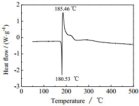 3.3 MCDAT和ADMCAT的热性能 3.3.1 MCDAT的热性能采用DSC方法研究了MCDAT的热稳定性(实验条件:动态氮气气氛,压力为0.1 MPa,温度为25~500 ℃,升温速率为5 ℃·min-1,试样量约0.5 ~1.0 mg,试样皿为铝盘),实验结果如图 3所示。由图 3可知,MCDAT存在一个吸热熔化峰,一个放热分解峰,表明该化合物的热分解是经历吸热熔化的过程,吸热峰为180.53 ℃。
