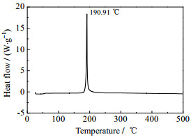 由图 4可知,ADMCAT不存在吸热熔化峰,只存在放热分解峰,表明该化合物的热分解是没有经历吸热熔化相变过程,而是由固相状态直接分解。ADMCAT只在190.91 ℃存在热分解峰,表明该化合物的热分解只经历一个分解过程。