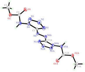5, 5′-偶氮双(1-甲氧基甲酰胺基四唑) (ADMCAT)是制备高能含能化合物5, 5′-偶氮双(1-硝胺基四唑)的关键中间体。Fischer等[19]报道了以1, 5-二氨基四唑为原料,经缩合、氧化偶联、酸解等反应得到1, 1′-二氨基-5, 5′-偶氮双四唑,Li等[20]以1, 1′-二氨基-5, 5′-偶氮双四唑为原料,经五氧化二氮硝化、氢氧化钾成盐,然后酸化合成ABNAT,总收率为22.2%;而以1-甲氧基甲酰基-1, 5-二氨基四唑(MCDAT)经偶氮化、硝化、氢氧化钾成盐、酸化合成ABNAT,总收率为33.5%。因此,本研究以甲氧基甲酰肼为原料,合成了ABNAT的关键中间体ADMCAT,对"一锅法"合成MCDAT反应机理进行了初步探讨;培养了ADMCAT的单晶,并进行了单晶X-射线衍射测试及晶体结构解析。