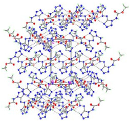 如图 5、6和表 2中的键长数据所示,ADMCAT分子中四唑环和偶氮键的所有键长均处于标准的单键和双键之间,表明彼此间存在着较强的离域共轭效应,亚氨基N原子也参与了四唑环和偶氮键的共轭作用,上述各部分处于同一平面;晶体结构解析表明,甲氧基甲酰基所在平面近乎垂直于四唑环与偶氮键所在的平面。晶胞堆积图和氢键数据(见表 3)可以看出,晶体中氮氢原子间存在一定的氢键作用。