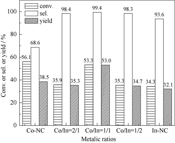 图 1 不同Co/In摩尔比ZIFs基催化剂反应性能 Fig.1 Catalytic performances of ZIFs-based catalysts with different Co/In mol ratios |