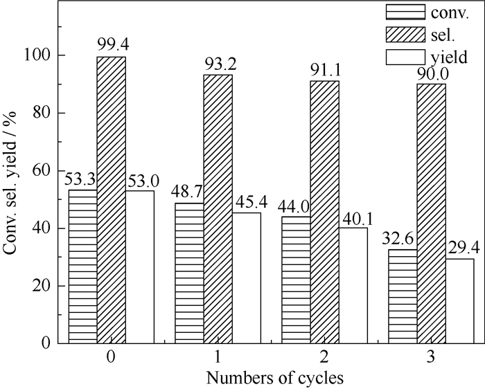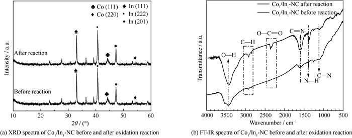 在反应多次循环后,对Co1/In1-NC进行了XRD和FT-IR分析。从图 11(a)的结果来看,Co1/In1-NC的XRD峰位置几乎没有变化,而强度略有下降,表明催化剂的结构较为稳定。反应后Co1/In1-NC的FT-IR结果如图 11(b)所示,可以看出,反应后Co1/In1-NC在2 362.4 cm-1处出现明显的O—C=O峰,是氧化反应所致。