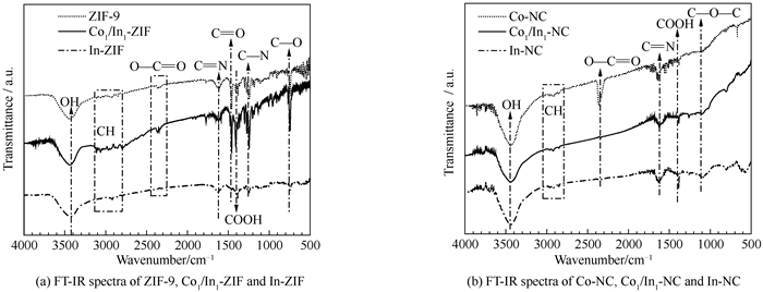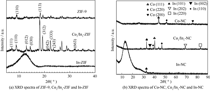 ZIF-9(Co-ZIF)、Co1/In1-ZIF和In-ZIF的XRD谱图如图 2(a)所示,Co1/In1-ZIF在2θ=7.1°、8.9°、12.8°、14.4°、18.1°、19.2°、21.4°、22.3°、23.6°和32.2°处均有峰,分别对应(111)、(110)、(012)、(030)、(113)、(312)、(042)、(333)、(243)和(663)晶面,与具有方钠石(SOD)拓扑结构的ZIF-9相吻合[25-26],说明Co1/In1-ZIF继承了ZIF-9的SOD拓扑结构[27-28]。此外,In-ZIFs的XRD没有明显的特征衍射峰,说明In3+未与苯并咪唑配位形成晶体结构。上述材料在高温碳化后(图 2(b)),Co-NC在2θ=44.26°、51.52°和75.78°处有衍射峰,分别对应金属Co的(111)、(200)和(220)晶面(PDF#44-0962)。没有检测到氧化钴的存在,可能是由于含量较低[29]。Co1/In1-NC检测出了金属Co的(111)晶面,此外,还在2θ=33.0°、36.4°、39.3°、40.5°、47.2°、69.1°、83.4°等处出现了峰,表明有混合金属碳化物Co3InC0.75以及立方相In2O3的形成[30]。相较而言,In-NC只显示出立方相In2O3的生成。