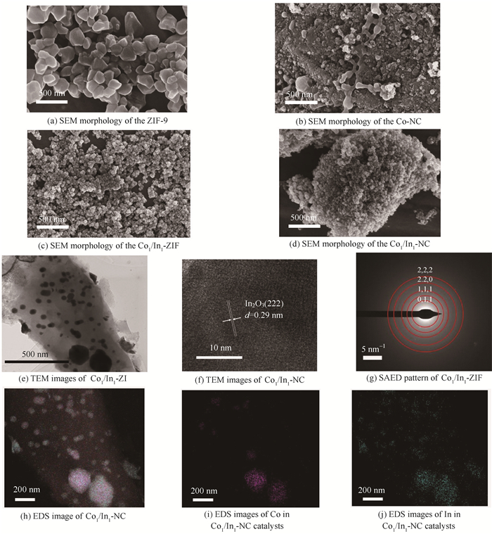 图 3 ZIF-9 (a)、Co-NC (b)、Co1/In1-ZIF (c)和Co1/In1-NC (d)的SEM图、Co1/In1-NC的TEM图(e-f)、SAED图(g)以及EDS元素分布图(h-j) Fig.3 SEM images of ZIF-9 (a), Co-NC (b), Co1/In1-ZIF (c) and Co1/In1-NC (d), TEM images of Co1/In1-NC (e-f), SAED pattern(g) and EDS elemental mappings(h-j) of Co1/In1-NC |