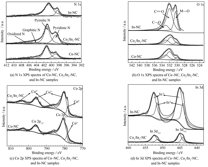 用XPS测定了Co-NC、Co1/In1-NC和In-NC的化学组成和表面元素价态。如图 5(a)所示,N 1s谱图在401.1 eV和308.8 eV处的强峰分别对应吡咯N和吡啶N,但催化剂样品表面没有出现金属(Me)—N键,这说明Co1/In1-NC表面的Co/In金属不是以Me—N键锚定在炭材料表面。O 1s谱图(图 5(b))在530.1、531.6、533.1 eV左右出现3个峰,分别对应金属(Me)—O、C=O、C—O。Co 2p谱图(图 5(c))在780.7 eV (Co 2p3/2)和796.3 eV(Co 2p1/2)的峰归属于Co3+,而在786.1 eV (Co 2p3/2)和802.9 eV (Co 2p1/2) 的峰归属于Co2+。此外,还出现了Co0的峰,位于778.8 eV (Co 2p3/2)[36]。而在In 3 d谱图(图 5(d))中,分别位于444.8 eV (In 3d5/2)和452.5 eV(In 3d3/2)的峰归属于In3+,而分别位于443.9 eV (In 3d5/2)和451.5 eV (In 3d3/2) 的峰归属于In0[37],说明在热解过程中,部分金属离子被还原。