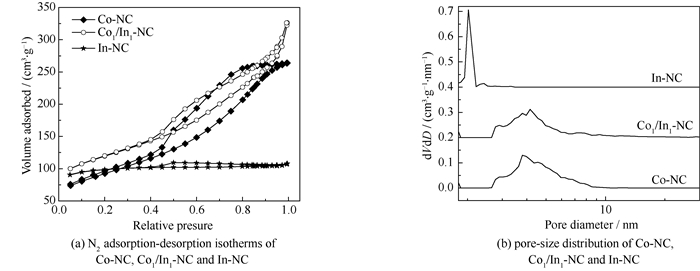 如图 6所示,In-NC的N2吸附/解吸等温线为经典的Ⅰ型等温线,说明In-NC的孔道以微孔为主。Co-NC和Co1/In1-NC的吸附/解吸等温线均为典型的Ⅰ型和Ⅳ型等温线组合,具有明显的滞后回环,说明样品以微孔和介孔为主。Co-NC、Co1/In1-NC和In-NC的BET比表面积分别是327.0、428.6、303.0 m2·g-1(表 1),可以看出,随着In3+掺入ZIF-9,热解得到催化剂的比表面积和总孔容均有增加。