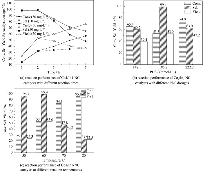 图 7 不同反应时间、PDS投加量和反应温度下Co1/In1-NC催化活化过硫酸盐氧化环己醇性能 Fig.7 Effect of time, PDS dosages and temperatures on the oxidation of cyclohexanol Reaction conditions: [cyclohexanol]=103.2 mmol·L-1, [PDS]=185.2 mmol·L-1, T= 60 ℃, t= 2 h, [catalyst]=100 mg·L-1 |