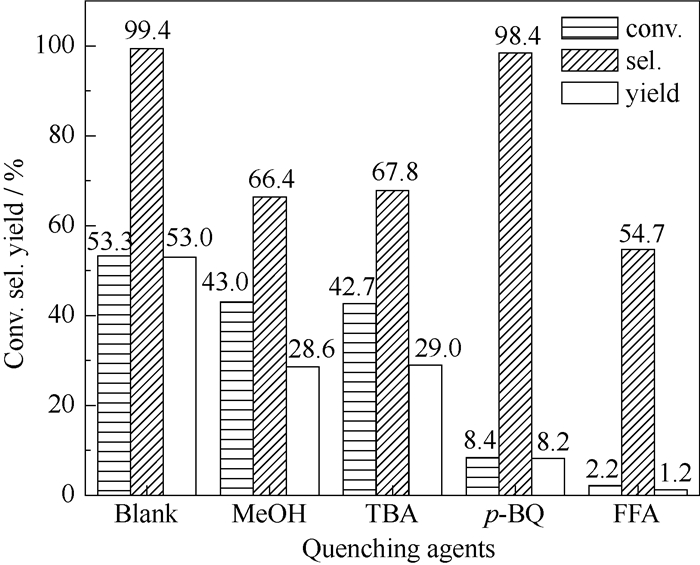 图 8 自由基猝灭剂对环己醇氧化的影响 Fig.8 Effect of free radical quenching agents on the oxidation of cyclohexanol Reaction conditions: [cyclohexanol] = 103.2 mmol·L-1, [PDS] = 185.2 mmol·L-1, T= 60 ℃, t= 2 h, [catalyst] = 100 mg·L-1, molar ratio of bursting agent/PDS = 10/1 |