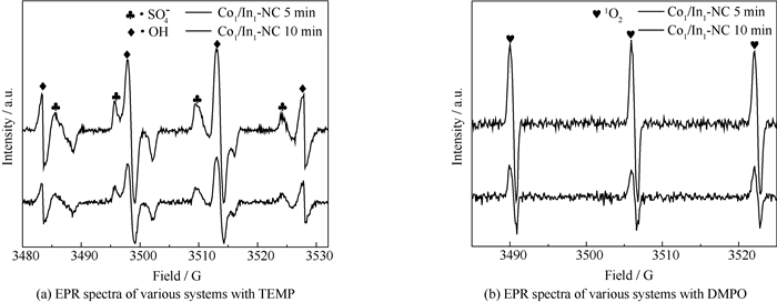 采用EPR检测了Co1/In1-NC/PDS系统中的ROS,如图 9所示。分别使用5, 5-二甲基-1-氧化吡咯啉(DMPO)作为捕获剂检测·OH和·SO4-自由基,用2, 2, 6, 6-四甲基-4-哌啶醇(TEMP)作为捕获剂检测1O2物种。由图 9(a)可以看出,所得信号为峰高1∶2∶2∶1的四重峰,每重峰的高、低两部分分别代表DMPO-·OH和DMPO-·SO4-,表明反应体系中存在·OH和·SO4-自由基。而图 9(b)呈现出强度为1∶1∶1的特征三重峰,对应TEMP-1O2的存在。此外,·OH、·SO4-和1O2的信号随反应时间由5 min增加到10 min,其强度明显增强,说明·OH、·SO4-和1O2均参与了氧化环己醇的反应。