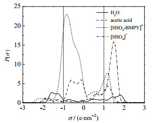 计算得到的σ-Profile图如图 10所示。水和[HSO3-BMPy]+既具有提供氢键的能力,也具有接受氢键的能力;乙酸和[HSO4]−则主要作为氢键受体存在。乙酸和水均具有一定的与[HSO3-BMPy][HSO4]结合的能力,使水与乙酸不易分离,汽液平衡线更靠近对角线。水在氢键供体区的峰比乙酸高,提供氢键的能力更强。因此相较于乙酸,[HSO3-BMPy][HSO4]更易与水紧密结合,在富水区对汽液平衡曲线的影响更大。从σ-Profile图分析得到的结论与实验结果一致,说明了实验结果的可靠性。