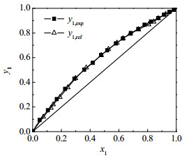 对于在相同温度和压力下汽相摩尔体积与理想气体产生负偏差的物质,如乙酸,可以产生两分子形成二聚体的化学平衡[17]。此时,用来表示与理想气体偏差程度的逸度系数无法满足精度要求,需要根据缔合体系的特点进行相应的调整。Hayden-O′Connell(HOC)方法[18]常被用来校正由乙酸缔合现象引起的汽相非理想性的偏差。本研究使用Aspen Plus进行Herington面积检验,输入汽液平衡实验数据T、xi和yi值,通过NRTL-HOC模型[19]进行回归,得出的热力学一致性检验结果D−J=−3.45 < 10,符合热力学一致性检验。从图 2可以看出,实验值y1, exp与文献值y1, ref吻合较好;结合热力学一致性检验结果可知,测得的实验数据是可靠的。