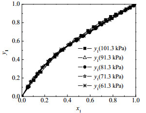 图 3 101.3、91.3、81.3、71.3、61.3 kPa下测得水(1)+乙酸(2)体系汽液平衡实验值y1-x1对比图 Fig.3 y1-x1 diagram of vapor-liquid equilibrium of the water(1) + acetic acid(2) system measured at 101.3, 91.3, 81.3, 71.3, 61.3 kPa |