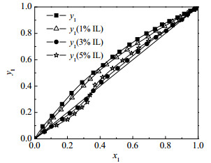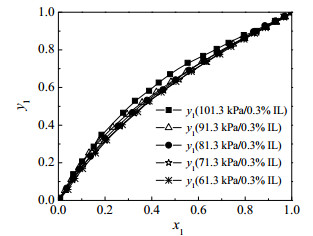 图 7 101.3 kPa下测得水(1)+乙酸(2) +[HSO3-BMPy][HSO4](3)体系在IL摩尔分数为1%、3%、5%时的汽液平衡实验值y1-x1对比图 Fig.7 y1-x1 diagram of vapor-liquid equilibrium of the water(1) + acetic acid(2) + [HSO3-BMPy][HSO4](3) system measured at 101.3 kPa when mole fraction of IL is 1%, 3%, 5%, respectively |