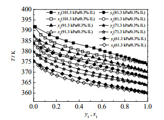 图 5为三元体系的y1-x1对比图,图 6为三元体系的T-y1-x1对比图。图 5、6表明加入离子液体摩尔分数为乙酸摩尔分数0.003的水+乙酸+[HSO3-BMPy][HSO4]体系在减压条件下的汽液平衡线对比与水+乙酸体系大体相似。与减压条件下水+乙酸体系的五组数据对比,发现在同样的压力下,加入少量的离子液体会使原体系平衡温度略有降低。