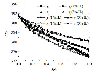 图 8 101.3 kPa下测得水(1)+乙酸(2) +[HSO3-BMPy][HSO4](3)体系在IL摩尔分数为1%、3%、5%时的汽液平衡实验值T-y1-x1对比图 Fig.8 T-y1-x1 diagram of vapor-liquid equilibrium of the water(1) + acetic acid(2) + [HSO3-BMPy][HSO4](3) system measured at 101.3 kPa when mole fraction of IL is 1%, 3%, 5%, respectively |