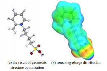 通过COSMOlogic软件计算水、乙酸、[HSO3-BMPy]+阳离子以及[HSO4]−阴离子的屏蔽电荷密度σ。为计算ILs中阳离子的电荷密度,通过TURBOMOLE量化计算模块对IL的几何结构进行了优化。在该软件中构建了IL的三维结构,并进行预优化。为在COSMOtherm中进行后续计算,原子的“Basis Set”设定为def-TZVP。给定对应电荷数生成分子轨道,使用DFT密度泛函方法,选择B3-LYP泛函开始计算,优化结果及分子表面屏蔽电荷分布如图 9所示,图中,ρ(σ)为屏蔽电荷密度函数。