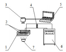 图 1 实验装置及流程 Fig.1 Schematic diagram of the experimental set-up 1. electrocoalescence cell 2. electrodes 3. microscope 4. transformer 5. computer 6. power supply 7. light source |