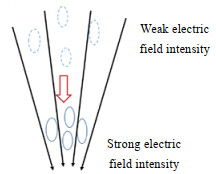 由图 8可知,非均匀电场中,液滴向着电极中心区域运动,受电场力作用拉伸变形。图 9给出了电场模拟图,由电场线稀疏可知,越靠近电极中心区域,场强越高。如图 10所示,液滴的迁移使原本分散的液滴聚集,缩短了彼此间距离[9]。