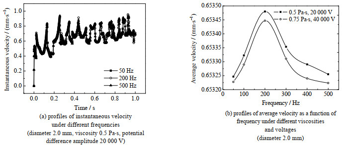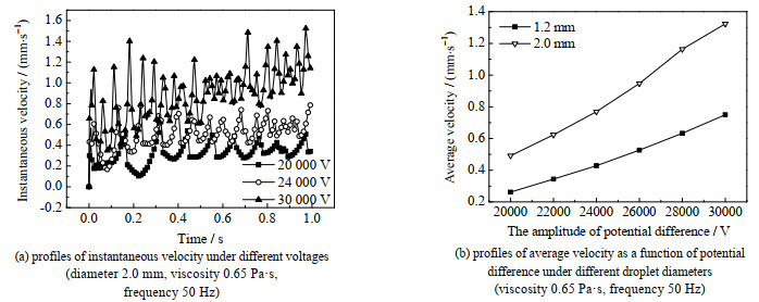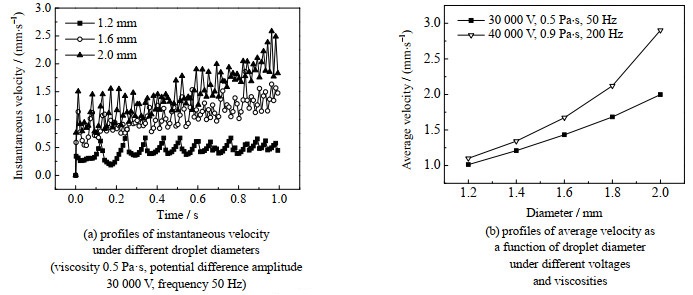 由图 15可知,随着液滴粒径的增加,液滴迁移速度增大,这是由于积累在液滴两端的荷电量增加,液滴所受介电泳力增大导致的。因此。由图 15(a)可知,液滴瞬时速度波动幅度和频率也随粒径增大,这是由于液滴粒径增大,液滴荷电量增加,电荷对液滴表面膜的冲击性增强,液滴的变形程度增加,导致液滴瞬时速度和频率呈现更明显的周期性振荡特征,其频率接近于电场频率。由图 15(b)可知,随着粒径的增加,液滴速度呈现指数增长,这是由于介电泳力增加的速率高于阻力增加的速率,使得液滴加速度不断升高,液滴迁移速度的增速越大。