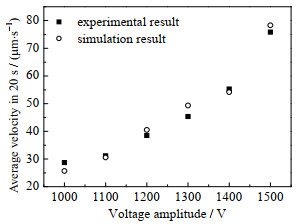 图 6 实验和模拟结果对比 Fig.6 Comparison of experimental and simulation results about effects of electric field strength on dielectrophoresis velocity (AC electric field: frequency 50 Hz) |
