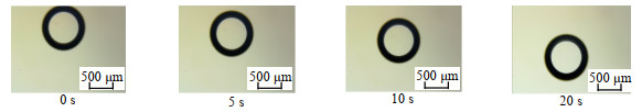 图 7 单液滴介电泳迁移 Fig.7 Dieletrophoresis results of single droplet (AC electric field 1 000 V, 50 Hz; droplet diameter 1.041 mm) |