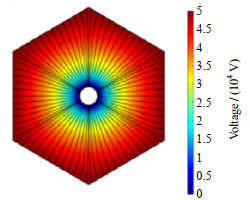 图 9 同轴六边形-圆电极电场模拟图 Fig.9 Simulative electric fields of coaxial hexagon-circle electrodes (different colors present different electric potentials) |