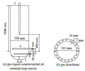 图 1 气液逆流喷射式外环流反应器结构示意图 Fig.1 Schematic diagram of gas-liquid countercurrent jet external loop reactor 1. gas-liquid countercurrent jet external loop reactor cylinder 2. baffle 3. gas distributor 4. liquid feed tube 5. liquid nozzle |