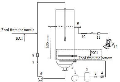 图 2 冷模实验流程图 Fig.2 Schematic diagram of experimental setup 1. air compressor 2. buffer tank 3. gas valve 4. gas rotor flow meter 5. gas-liquid countercurrent jet external loop reactor 6. pump 7. liquid valve 8. liquid rotor flow meter 9. liquid outlet 10. conductivity electrode 11. conductivity instrument 12. computer |