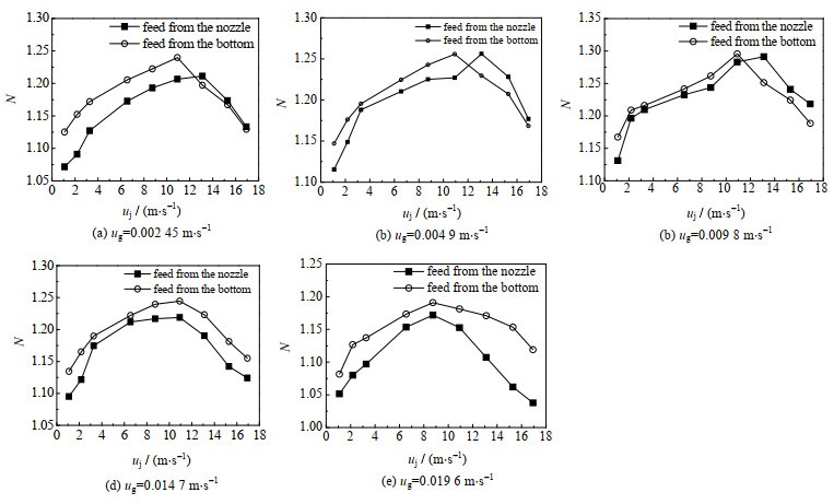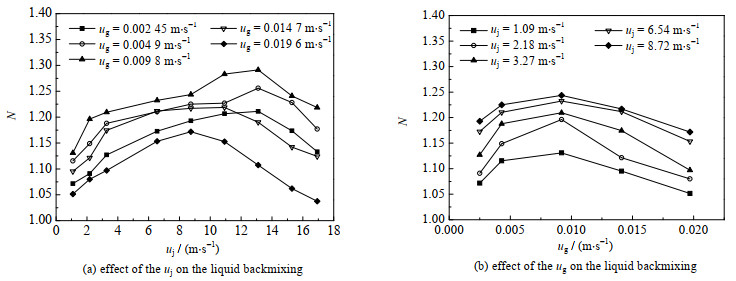 3 结果与讨论 3.1 操作条件对液相返混的影响图 3(a)为喷嘴进料时,不同ug下液相返混程度随喷嘴出口射流速度uj而变化,其中返混程度采用多釜串联模型参数N来表示。从图中可以看出,在ug一定的条件下,随着uj的增大,液相返混程度先减小后增大。图 3(b)为不同uj下液相返混程度随ug的变化,由图可知,当uj一定时,返混程度随ug的增大先减小后增大。