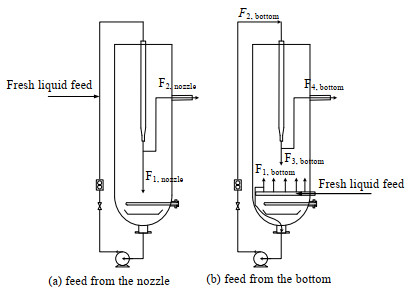 在低气速条件下,当uj较小时,从喷嘴进料的新鲜液体中能够到达反应器底部F1, nozzle的量较少,而发生短路的F2, nozzle较多;底部进料时向上运动的新鲜液体F1, bottom较多,使得发生短路的新鲜液体F4, bottom的量小于F2, nozzle,如图 6(a)所示,因此底部进料时的液相返混程度低于喷嘴进料;当uj较大时,喷嘴进料时发生短路的F2, nozzle较少,而底部进料时,由于气泡上升速度较小,气泡对新鲜液体携带作用较弱,大部分从底部进料的新鲜液体来不及被气泡携带向上运动,就在液体射流的作用下从反应器底部排出再经过外循环回路通过喷嘴进入反应器,此时发生短路的新鲜液体F4, bottom的量大于F2, nozzle,如图 6(b)所示,因此底部进料的液相返混程度大于喷嘴进料。