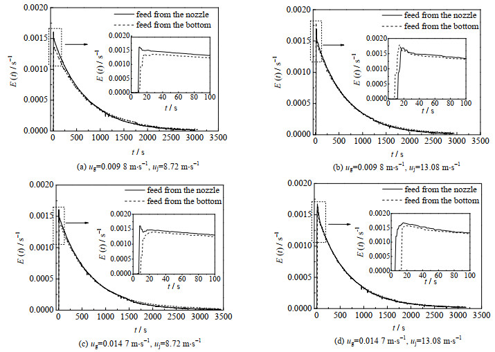 在气速较高的条件下,由于气泡上升速度较快,对底部进料的新鲜液体携带作用也较强,大部分底部进料的新鲜液体能很好地被气泡携带向上运动,发生短路的新鲜进料液体量减少,与此同时,从喷嘴进料后发生短路的新鲜液体的量增多,使得F4, bottom的量小于F2, nozzle的量,如图 6(c)、(d)所示,导致底部进料的液相返混程度小于喷嘴进料。