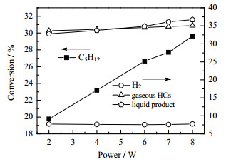图 4 不同放电功率下C5的转化率及产物选择性 Fig.4 Conversion and product selectivity of C5 at different discharge powers |