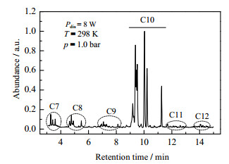 为进一步分析C5在等离子场中的反应机理,不同放电功率下C5转化率和气相产物的选择性被分析,如图 4所示。C5的转化率随放电功率的增加呈线性增加,这与光谱强度随功率变化的趋势一致。从C5的转化产物来看,主要包括气相和液相产物。气相产物中检测到H2,C1~C6的正构烷烃,异丁烷,乙烯,乙炔,异丁烯。另外,液相产物的GC-MS检测结果如图 5所示。液相产物中检测到C7~C12的正构烷烃和同分异构体。从图 5中得出,H2的选择性约为7.5%,气相产物和液相产物的选择性分别为35%左右,H2的选择性随功率变化基本维持不变,而气相产物和液相产物的选择性随功率增加略有提高。