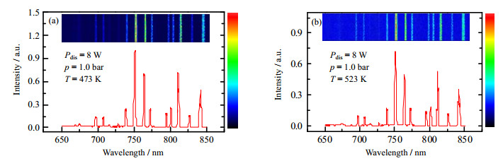 3.3 温度的影响本实验研究了298~523 K反应温度下的发射光谱特性。在光谱实验过程中发现随反应温度升高,光谱强度出现了先增强后减弱的现象,光谱强度最高点出现在473 K处,在523 K时光谱强度发生了衰减,如图 6所示。图中的条状谱图为该时刻光谱图对应的影像。在一定温度范围内,放电区域构成理想的电容器,但随温度的进一步增大,介质电容Cd升高,理想的电容器将会变成一个大的负载,会引起放电模式由丝状微放电转变为电阻电功率的损耗模式,进而导致放电的衰弱[25]。图 6的光谱数据很好印证了该结论,相比于473和523 K下光谱的强度减弱25%。