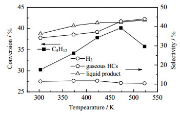 图 7 不同反应温度下 C5 的转化率及产物选择性 Fig.7 Conversion and product selectivity of C5 at different reaction temperatures |
