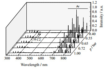 气体压力也是影响等离子体放电的一个重要参数,本实验测定了0.4~1.0 bar压力下的发射光谱图,并计算426.2 nm处CH和458.6 nm处C2自由基随压力的变化趋势,如图 8所示。从图中可知,随着压力的减小,光谱强度在逐渐增强,CH,C2自由基的生成量也与压力呈线性增加关系。压力越小,约化场强(放电区域单位气体分子的平均电场)增大[27],放电增强,产生的高能电子数量更多、能量更强,电子和C5的碰撞概率增加过,从而促进了CH、C2等自由基的生成[28]。