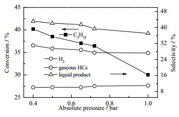 图 9 不同压力C5的转化率及产物选择性 Fig.9 Conversion and product selectivity of C5 at different reaction pressures |