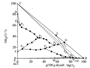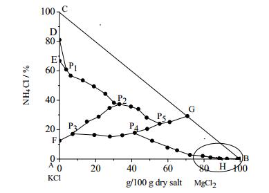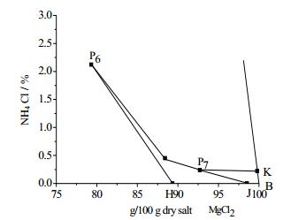 图 6 以25℃ KCl-MgCl2-NH4Cl-H2O为基础制备铵光卤石工艺(b)相图 Fig.6 Phase diagram of the KCl-MgCl2-NH4Cl-H2O system for NH4Cl·MgCl2·6H2O and KCl production (b) at 25℃ |