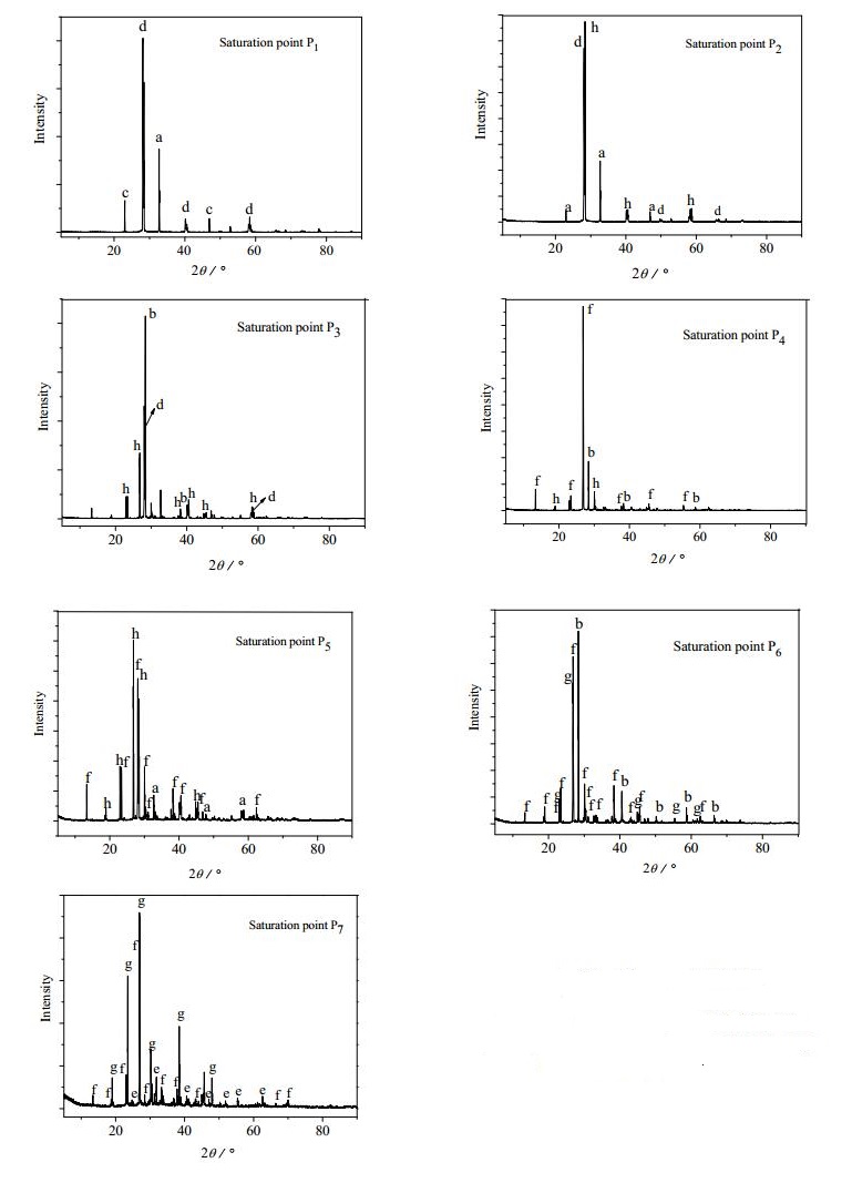 图 3为各共饱点对应的平衡固相的XRD谱图。将各个谱图与标准卡片一一对比,检索可知:点P1为NH4Cl、(NH4n, K1-n)Cl和(K1-m, NH4 m)Cl的共饱点,P2为NH4Cl、(K1-m, NH4 m)Cl和(NH4 n, K1-n)Cl·MgCl2·6H2O的共饱点,P3为KCl、(K1-m, NH4 m)Cl和(NH4 n, K1-n)Cl·MgCl2·6H2O的共饱点,P4为KCl、NH4Cl·MgCl2·6H2O和(NH4 n, K1-n)Cl·MgCl2·6H2O的共饱点,P5为NH4Cl、NH4Cl·MgCl2·6H2O和(NH4 n, K1-n)Cl·MgCl2·6H2O的共饱点,P6为KCl、KCl·MgCl2·6H2O和NH4Cl·MgCl2·6H2O的共饱点,P7为MgCl2·6H2O、KCl·MgCl2·6H2O和NH4Cl·MgCl2·6H2O的共饱点。