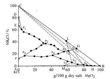 根据三元体系KCl-MgCl2-H2O相图可知,当向光卤石中加入一定量的水后,体系会析出氯化钾,母液组成为点H,此时母液中含有大量的氯化镁;为充分利用镁资源,向点H中加入NH4Cl为盐析剂,体系点落在HC连线上,随着NH4Cl量的增加体系点由H向C移动,当体系点落在HQ上时就会有铵光卤石析出,Q点是HC与P5G的交点。当体系点移动至T1处,结晶析出NH4Cl·MgCl2·6H2O后母液组成点刚好到达HP4上的N1点;分离出铵光卤石后向N1中再加入一定量的NH4Cl,体系会继续析出铵光卤石,当体系点移至T2时,结晶析出NH4Cl·MgCl2·6H2O后母液组成点为N2;向母液N2中加入一定量的光卤石和水,体系点落在N2M连线上且位于KCl的结晶区内,当体系点移至T3时,结晶析出氯化钾后母液组成为点恰好为N1;N1可返回系统使用构成稳定循环生产。工艺流程示意图见图 5。
